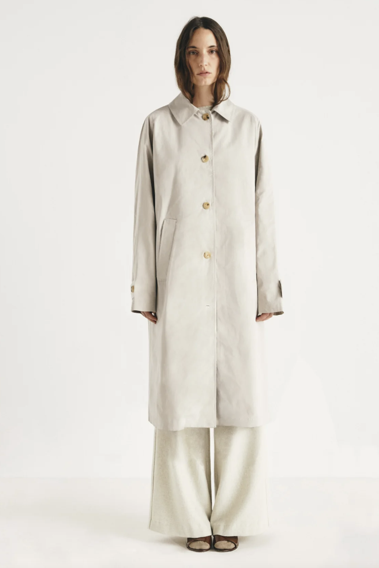 Gabardina larga en tejido encerado, repelente al agua, cierre con botonadura sencilla, bolsillos bordados en delantero, puño con tira abotonada.