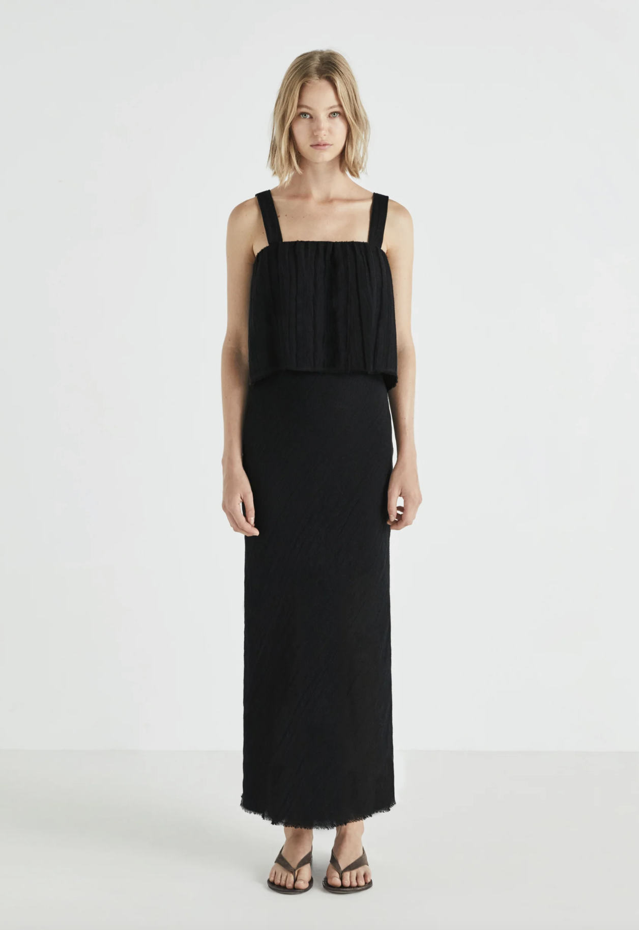 Top negro confeccionado en tejido ligero con estructura garza.