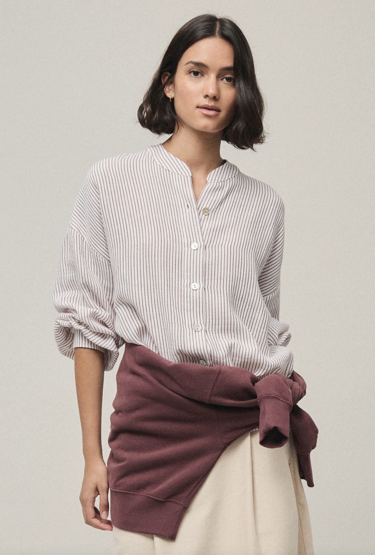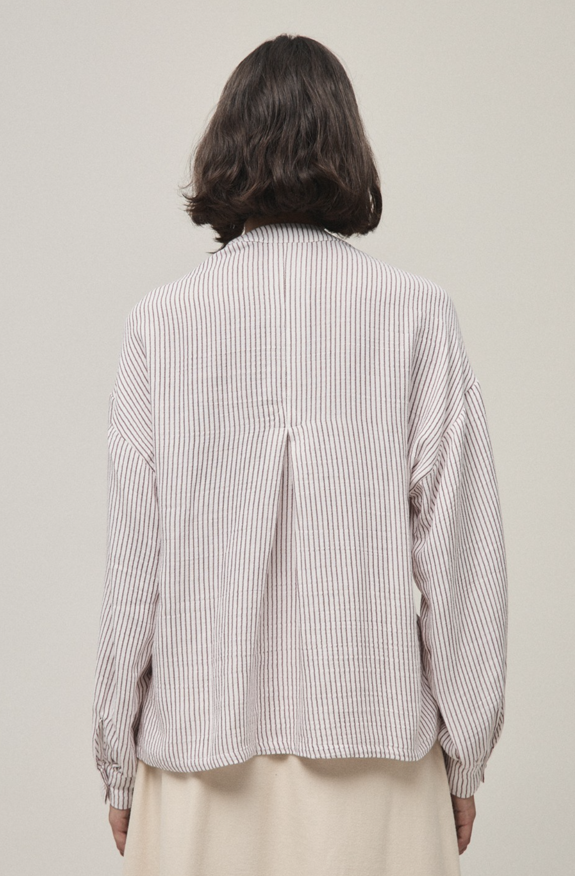 Camisa de rayas. Cuello mao, abotonadura central con botones de nácar, manga larga con puño fruncido. Espalda con detalle de pliegue para dar voúmen a la prenda.
