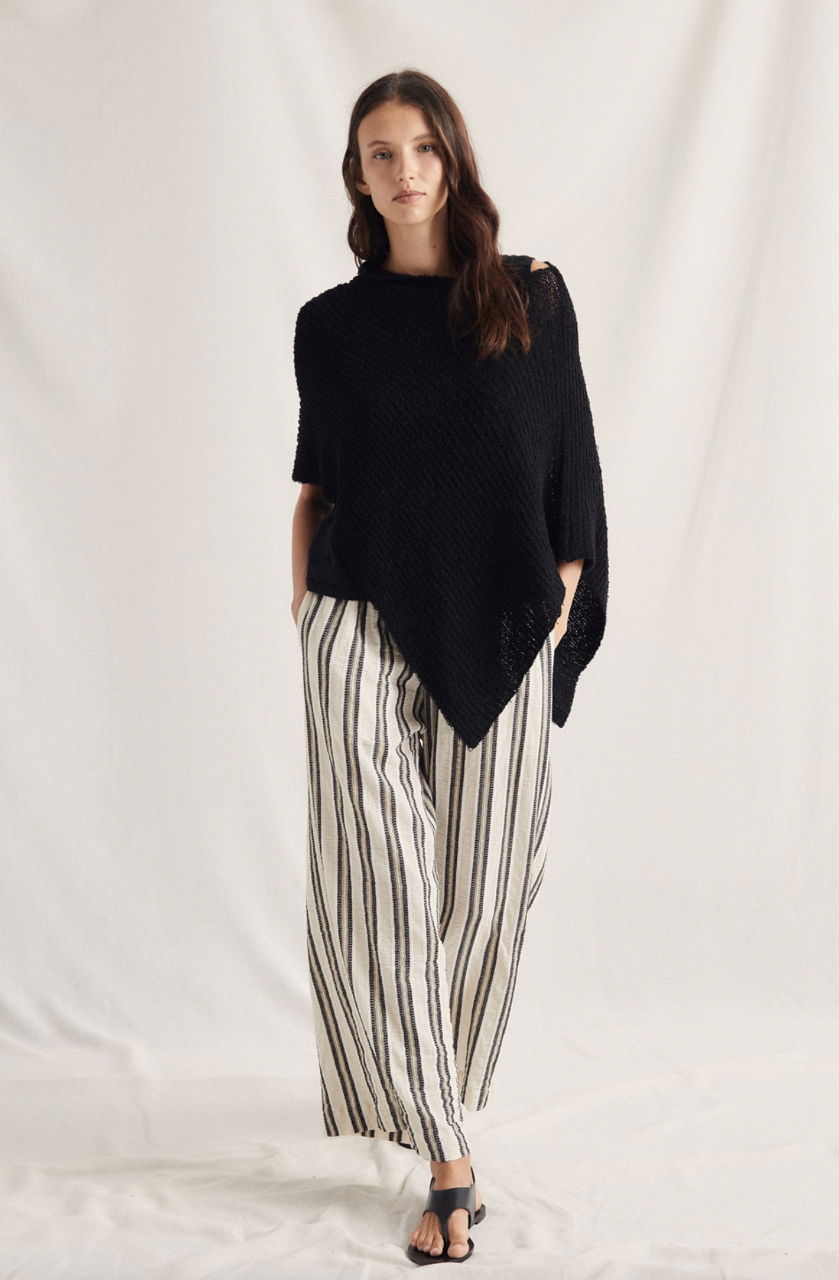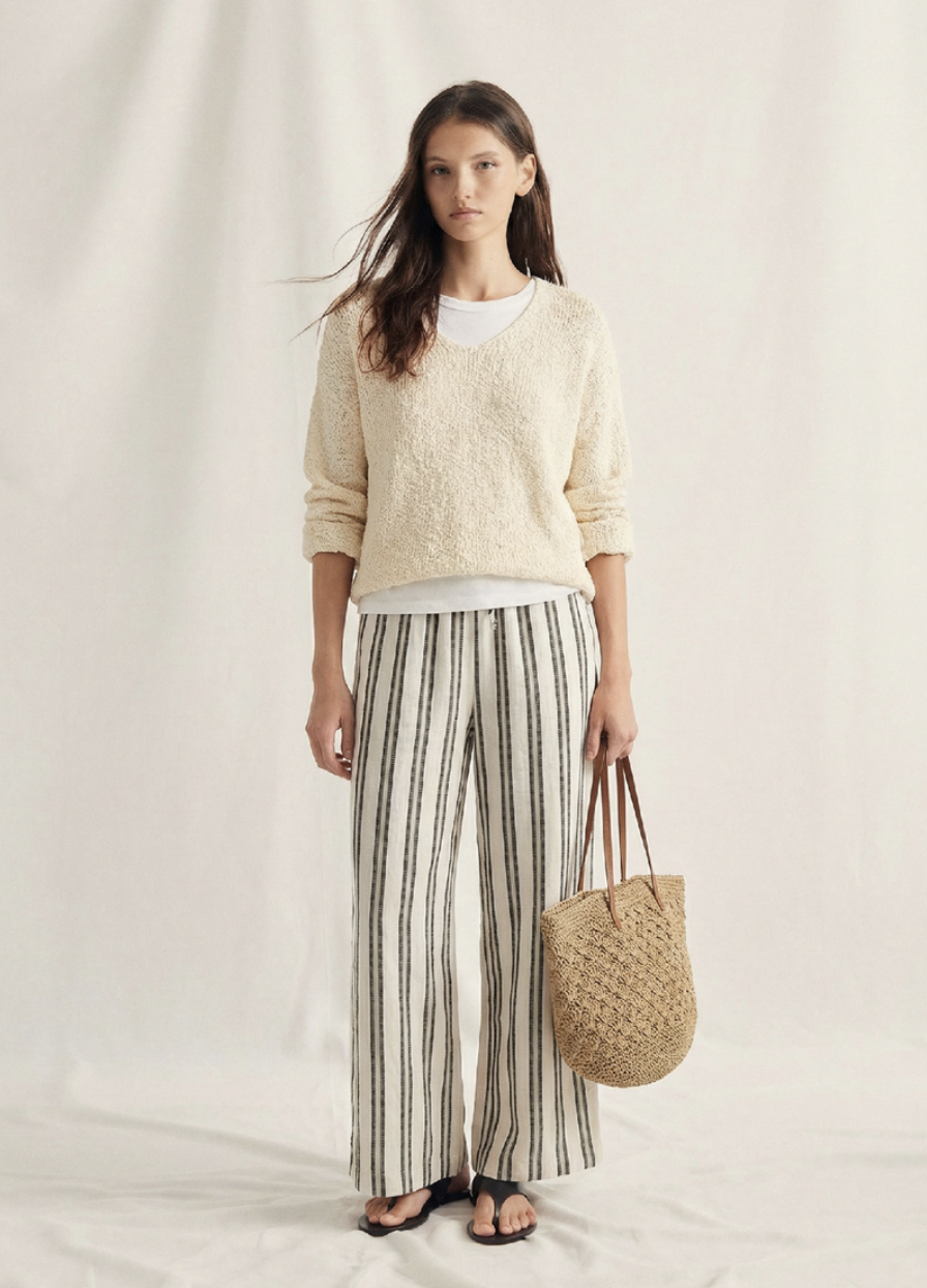 Pantalón de rayas de camal ancho y cinturilla ajustable con cordón del mismo tejido.