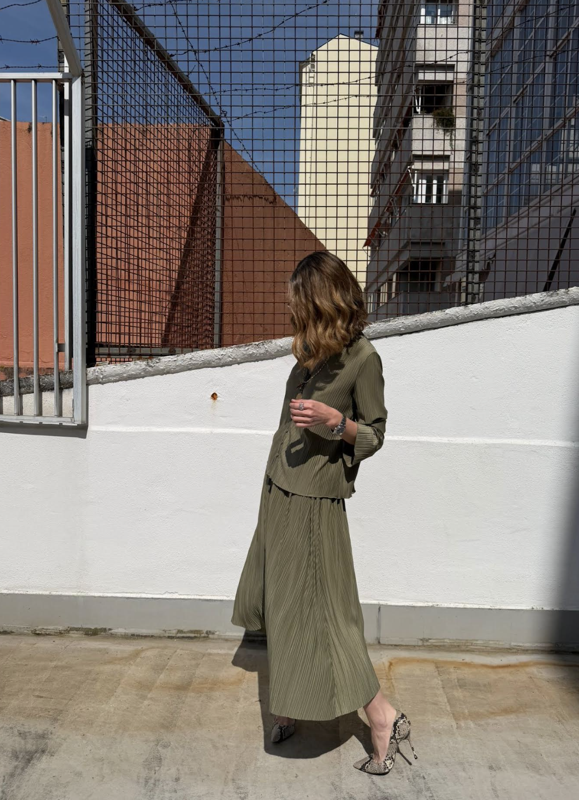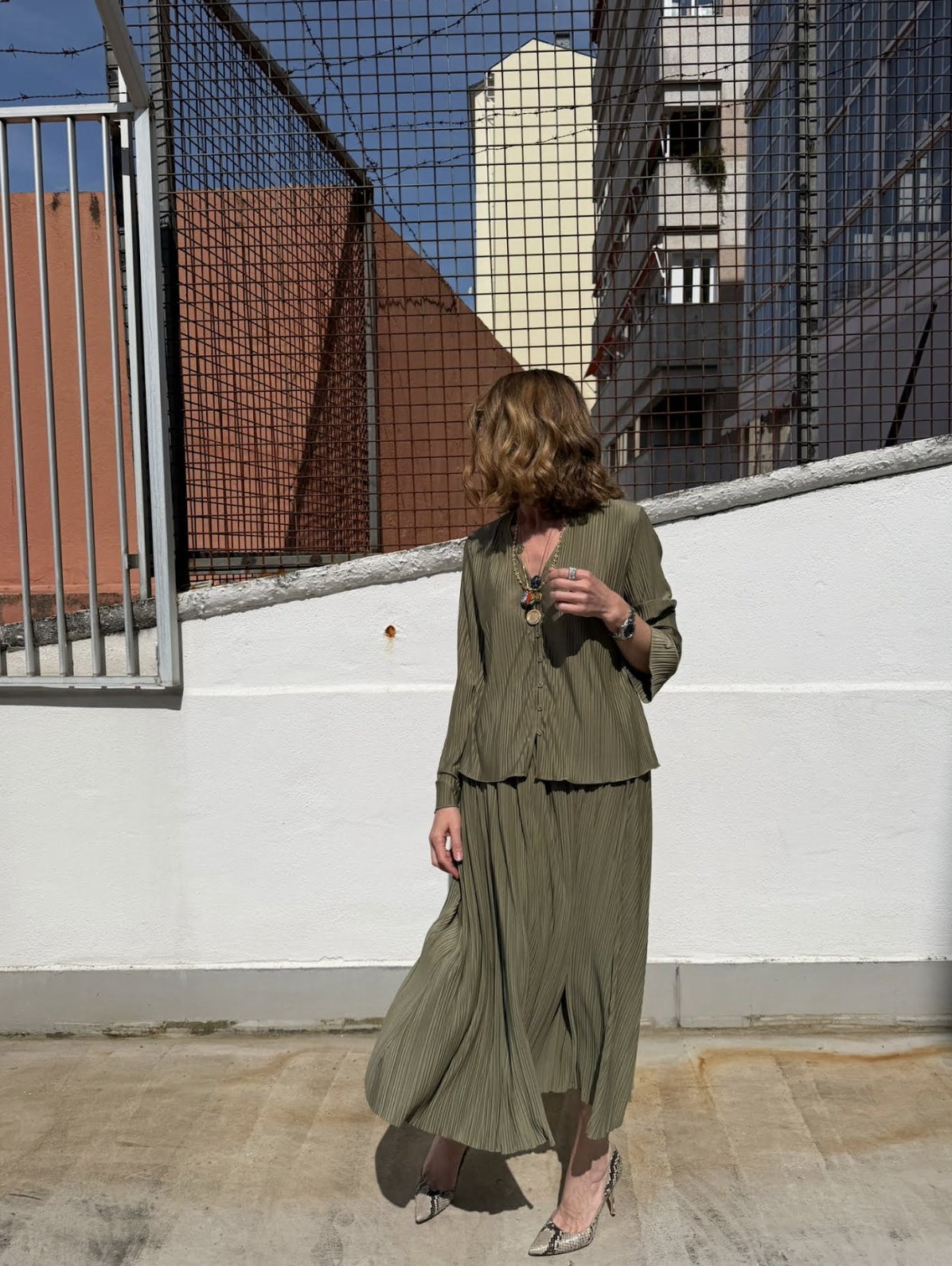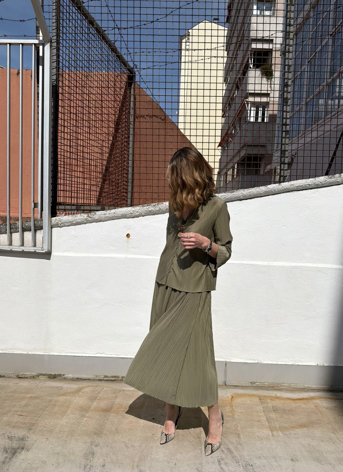 Falda en un favorecedor tono verde, con largo midi, de punto finamente plisada con corte regular. Cintura elástica. Tejido principal de mezcla de poliéster reciclado.