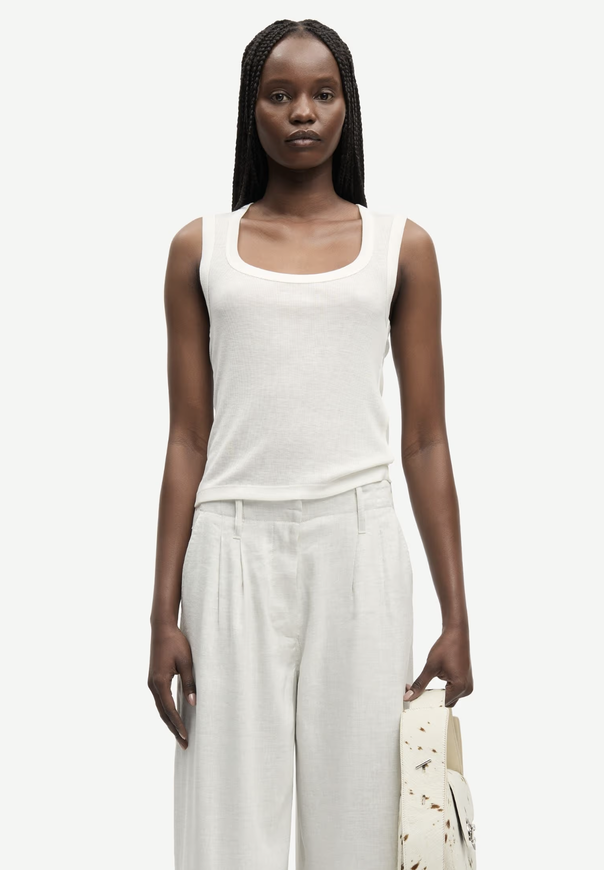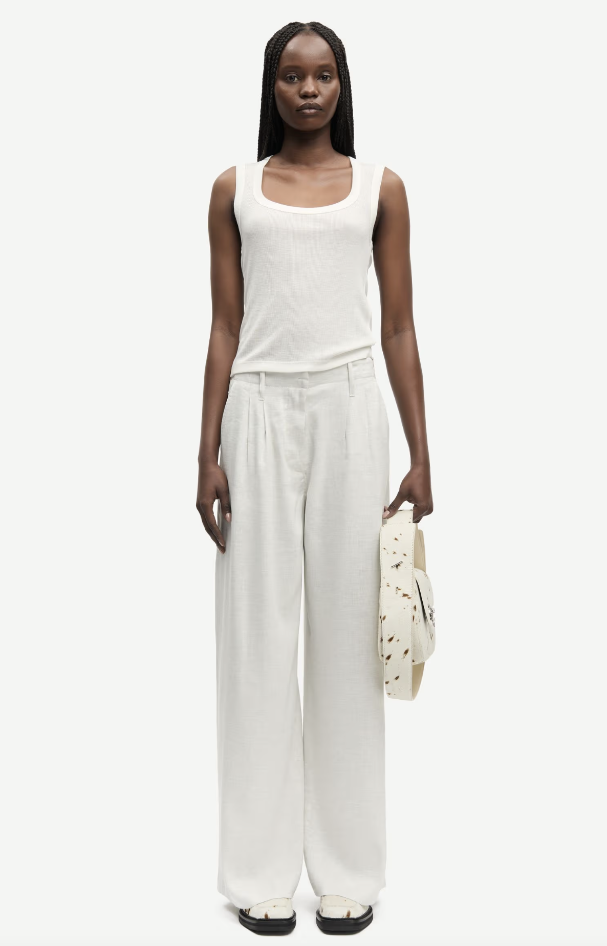 Pantalones de corte holgado y pernera ancha. Cierre frontal oculto con gancho y cremallera. Bolsillos laterales delanteros. Tejido principal de mezcla de lino.