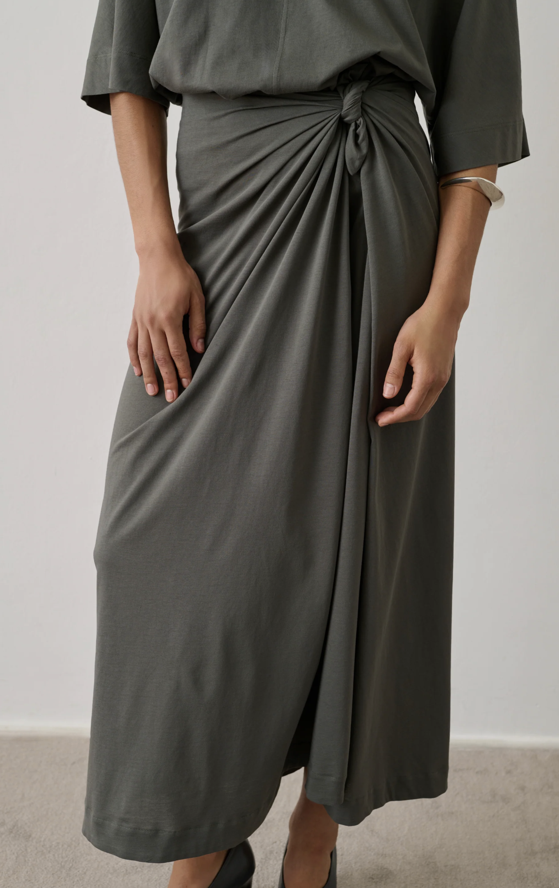 Falda larga de algodón de corte recto anudado a la cintura, se anuda en la parte delantera y con botón interior de sujeción