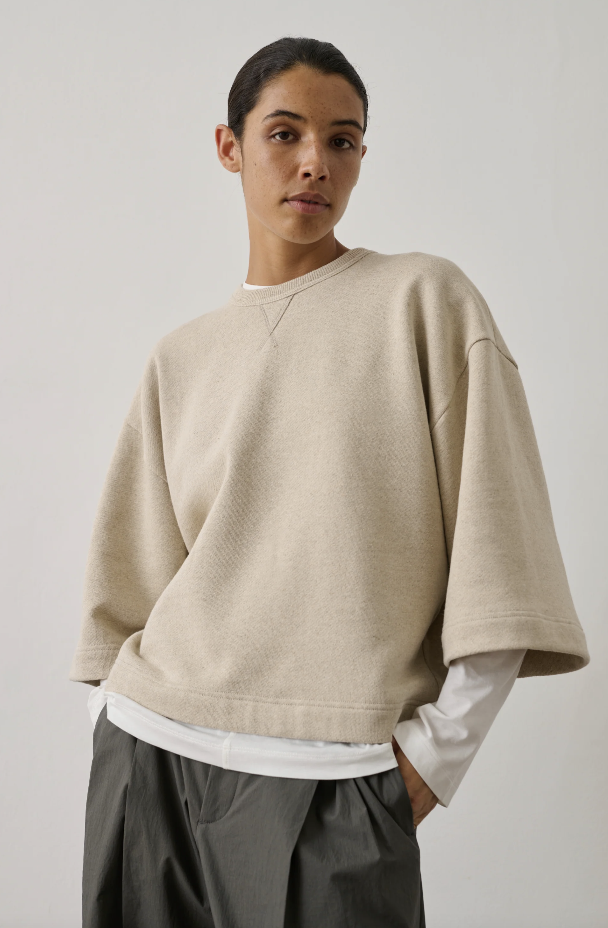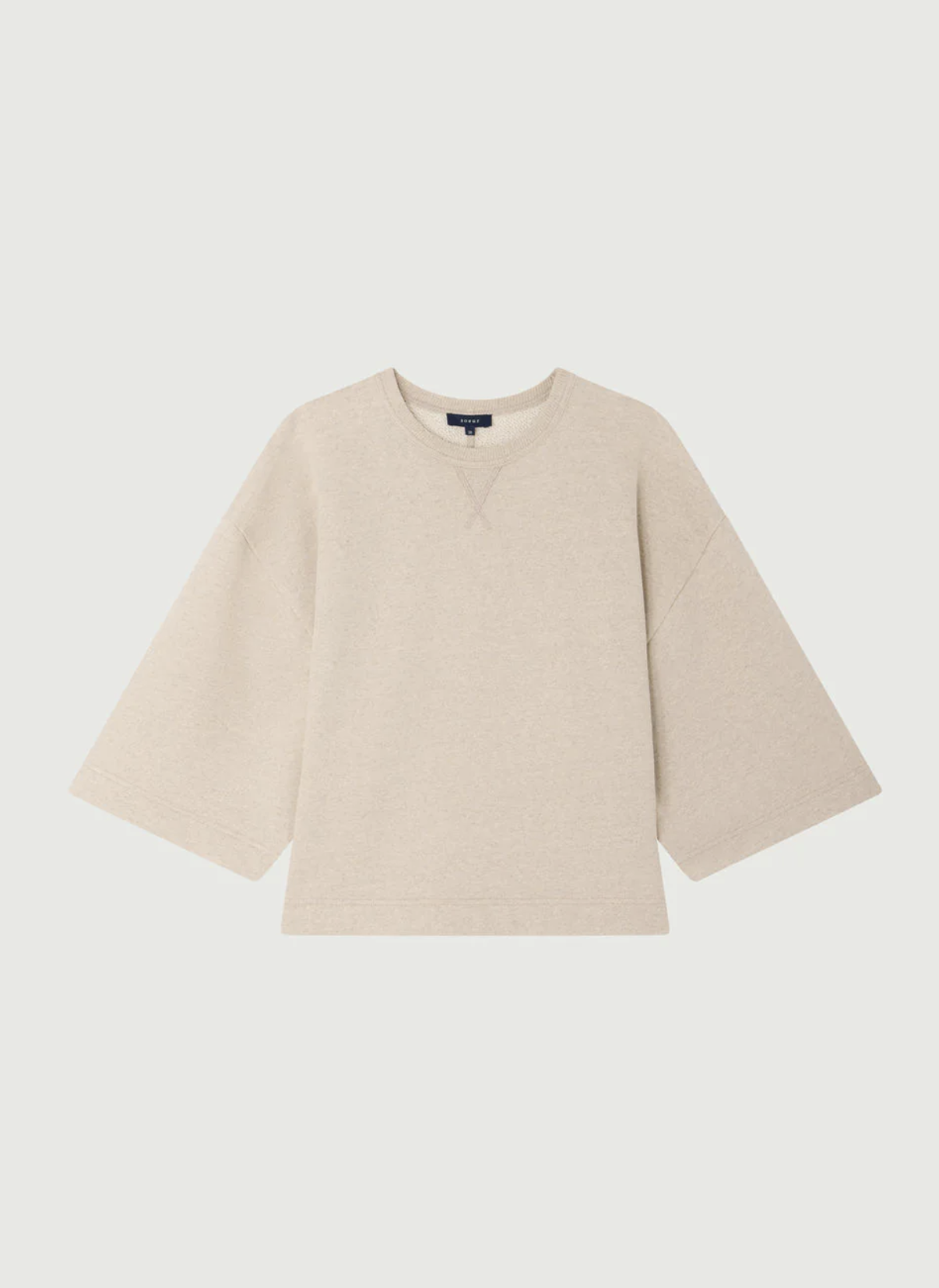 – Corte recto oversize – Mangas cortas – Cuello redondo – Pespunte en la parte central trasera – Detalle discreto en el cuello con costura plana – Felpa sin cardar